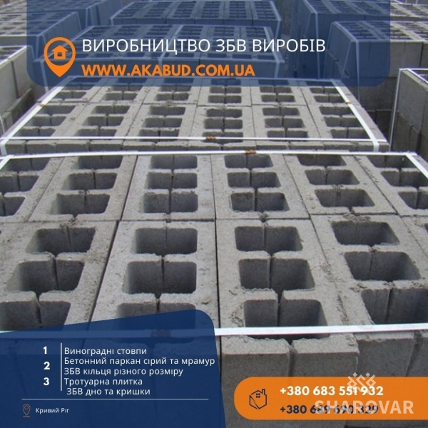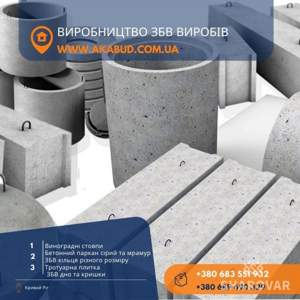 Мы производители ЖБИ изделий в Кривом Роге. Доставка собственным манипулятором. На складе всегда есть в наличии, тоесть доставляем быстро. Мы предлагаем товар собственного производства с гарантией. Столбики виноградные (армированные бетонные) – высота 2,2 м; 2,4 м; 2,7 м. Кольца, днища и крышки для колодцев – КС 10-9, КС 10,9, КС 15-9, КС 20-9. Плиты перекрытия, крышки ПП, днища ПН – 1 м, 1,5 м, 2 м. Плиты и брусчатка – сухопрессованная и вибролитая (разные формы, размеры, цвета). Еврозаборы – глянцевые, цветные и стандартные (серые оттенки и цветные под мрамор). Столбики для еврозабора Щелевые плиты – для свинарников и животноводческих помещений. Дорожные бордюры – 1000×300×150 мм. Работаем по всей Украине. ЖБИ изделия: (097) 414-39-54, (098) 741-59-17 – Анастасия akabud.com.ua